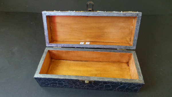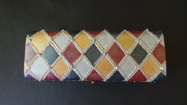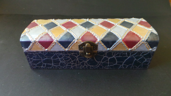 Caixa multiusos em madeira decorada com várias técnicas incluindo pintura. Tampa com relevos delineando losangos.