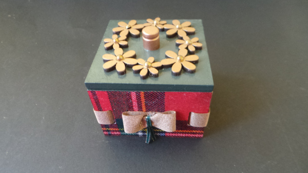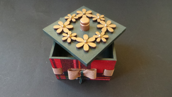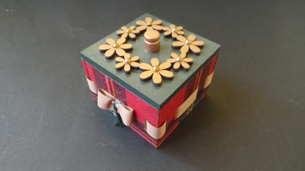 Small multipurpose wooden box decorated with various techniques including painting, decorative ribbon all around ending in a bow and lid decorated with a ring of wooden flowers.