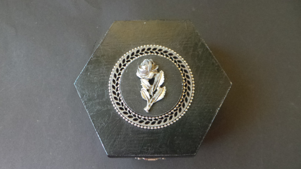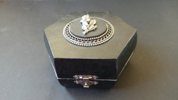 Small wooden multipurpose box with a clasp, painted black and decorated with a silver rose resting on a black wooden circle on the lid, which is in turn surrounded by two silver bead necklaces interspersed with a black wooden crown.