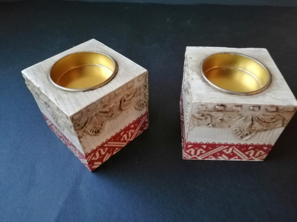 2 wooden candle holders decorated with a vintage motif, made using various techniques.