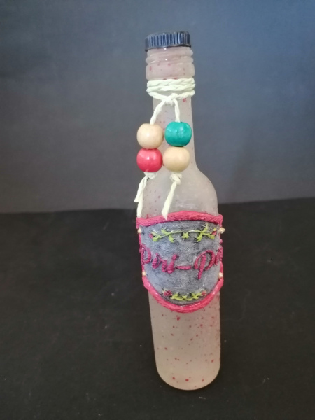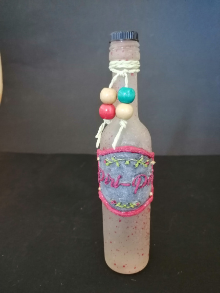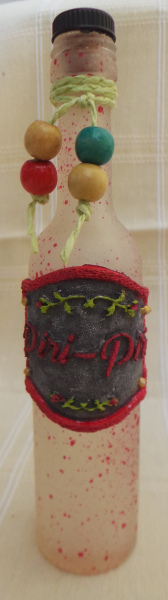 Pequeno frasco em vidro para molho piri-piri, decorado com label em biscuit e outras peças.