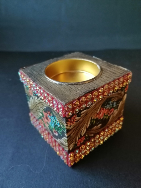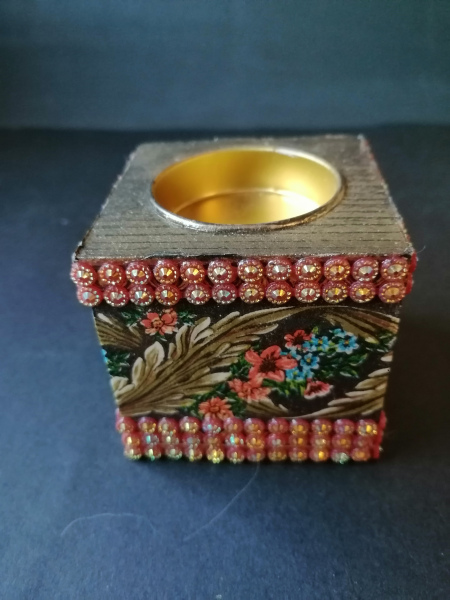 Wooden candle holder decorated with a floral motif, made using various techniques.