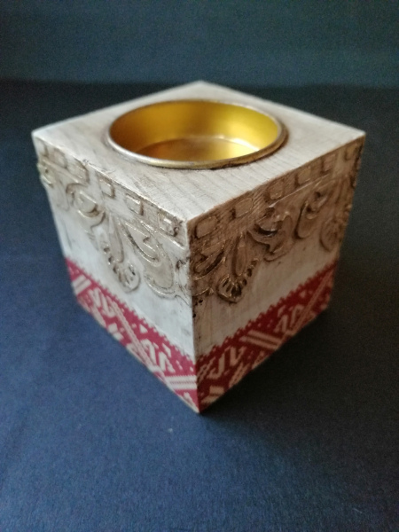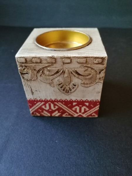 Wooden candle holder decorated with a vintage motif, made using various techniques.
