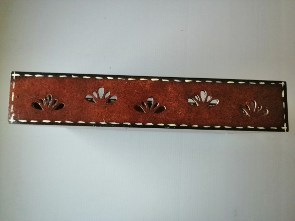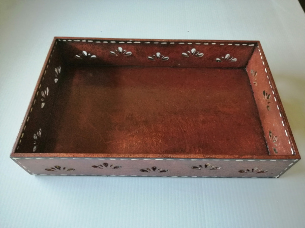 Multipurpose wooden tray painted brown with cut-out sides.